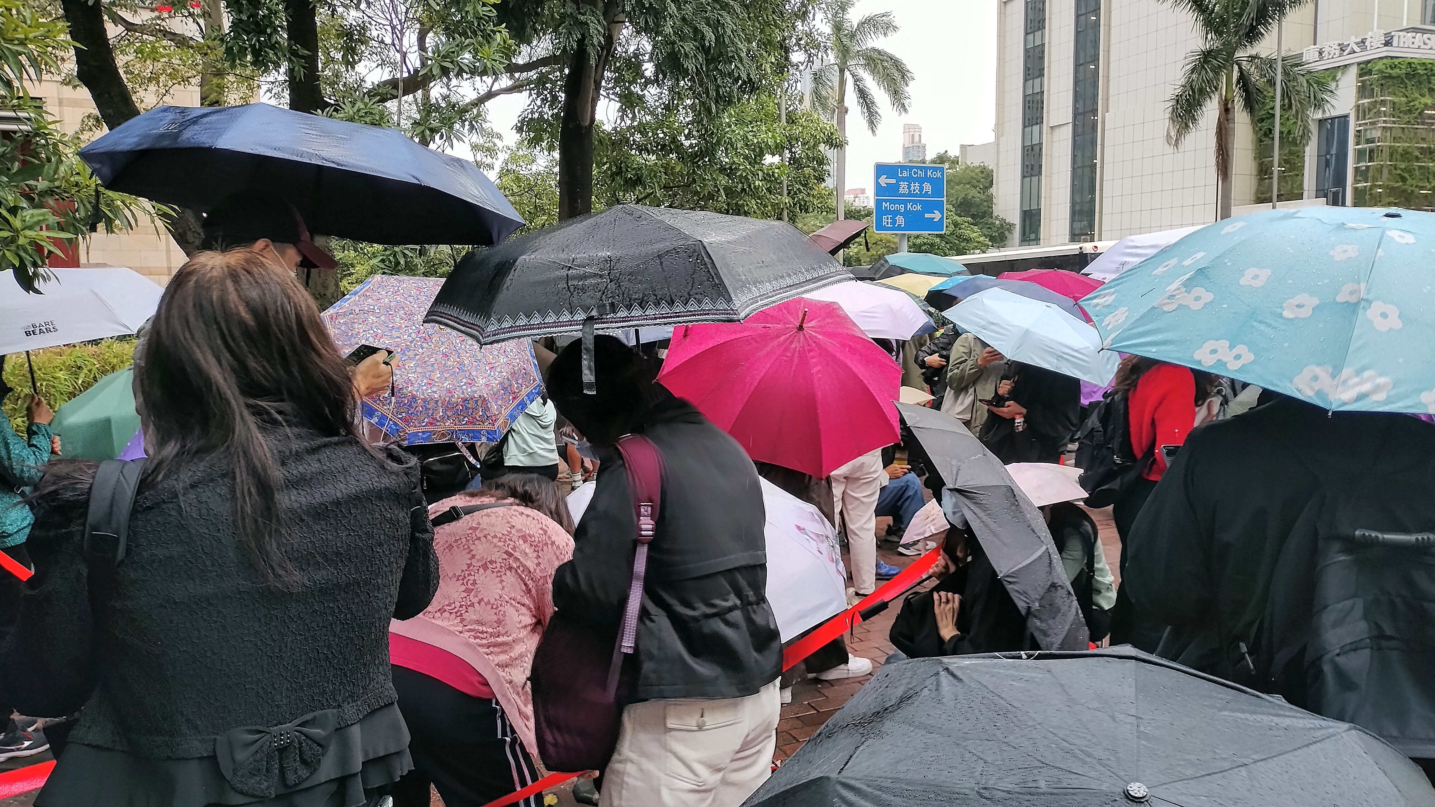 至中午 12 時許,首日聆訊仍未結束,法院外再有逾 60 人排隊,輪候翌日的旁聽籌,大部分人戴帽、口罩,並以雨傘遮擋容貌。