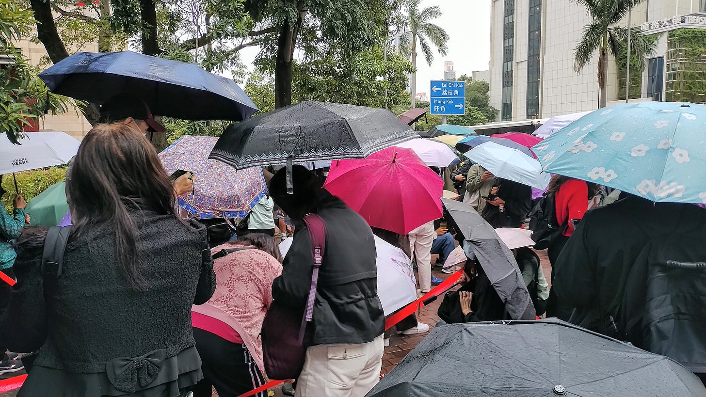 自上周五(9 日)中午起,西九龍裁判法院外已見排隊人龍,排首位的旁聽常客「姨婆」於凌晨約 4 時抵達。記者另發現當日下午 1 時多,約 10 名中年女子於相若時間到場排隊,大部分人戴上口罩、以雨傘遮擋容貌,未有回應記者提問。