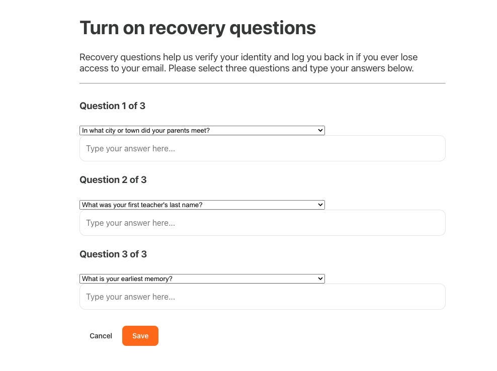 如果讀者按文章初段的建議,嘗試在 Substack 打開帳號登錄的驗證碼以收 2FA 之效,Substack 會要求你首先打開 recovery questions,設定幾條私密問題及答案,萬一丟失電郵登錄或者安裝 authenticator 的裝置時,透過回答 recovery questions 恢復帳號。
