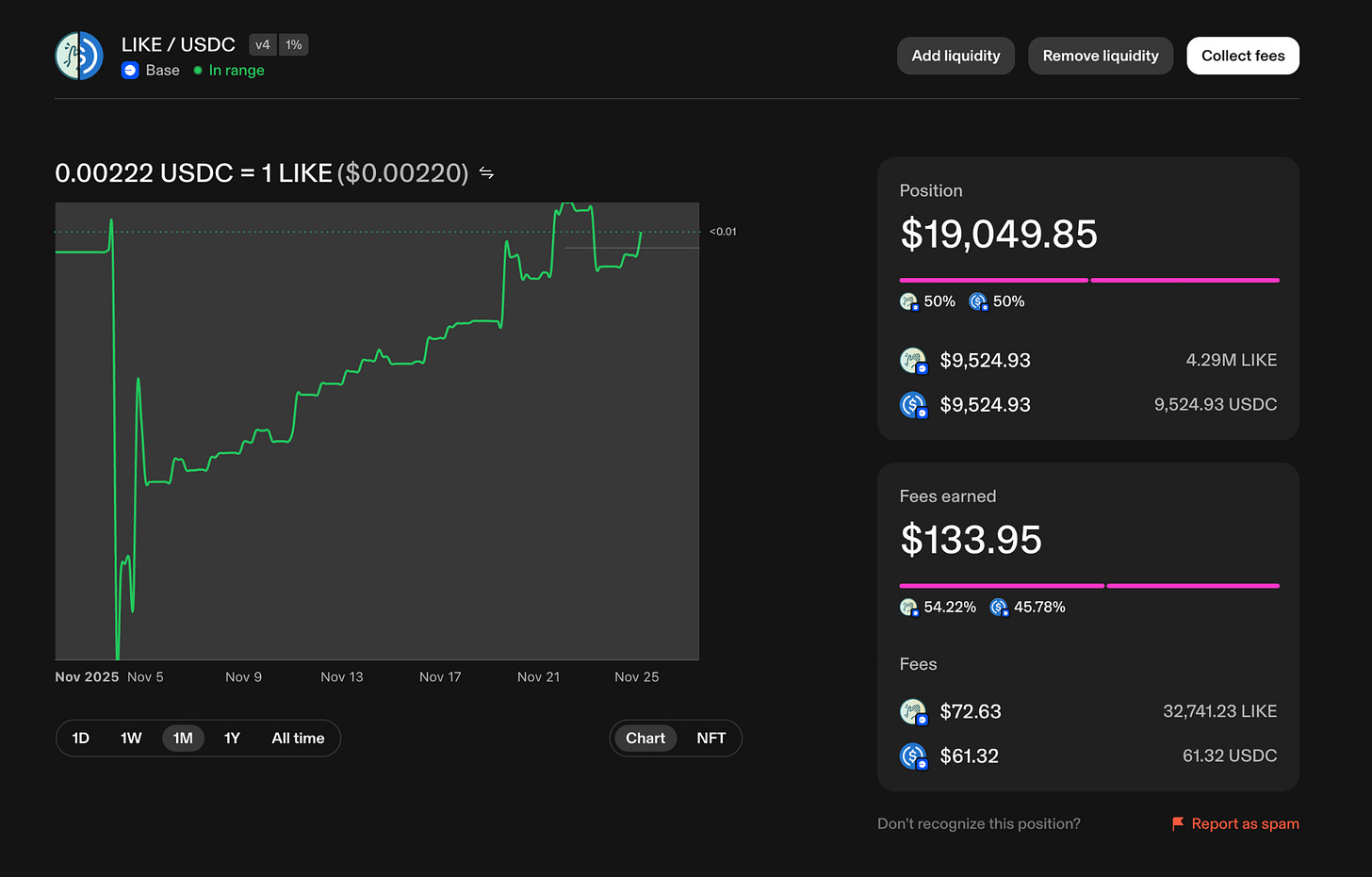 懊惱之際,想起我在 v3 升級前存了近二萬鎂的 LIKE/USDC 到 Uniswap 流動性池,於是領出當中的九分一應付,也順便提領了這陣子賺的手續費 133.95 鎂。粗略一算,年化回報約 11% 多,比我預期高了不少。這次空投金額我還算付得起,不介意由我負責,但如果由「讚托邦」LikeCoin 出資,定必更具意義。再考慮到讓初到 LikeCoin v3 報到的用戶參與治理,我特意「殺雞用牛刀」地提了 LIP-101 議案,請社群追認是次空投並作出撥款。由於空投乃「先斬後奏」,若 LIP-101 獲得通過,我才會報銷這筆費用,否則空投金額就由我來負責。