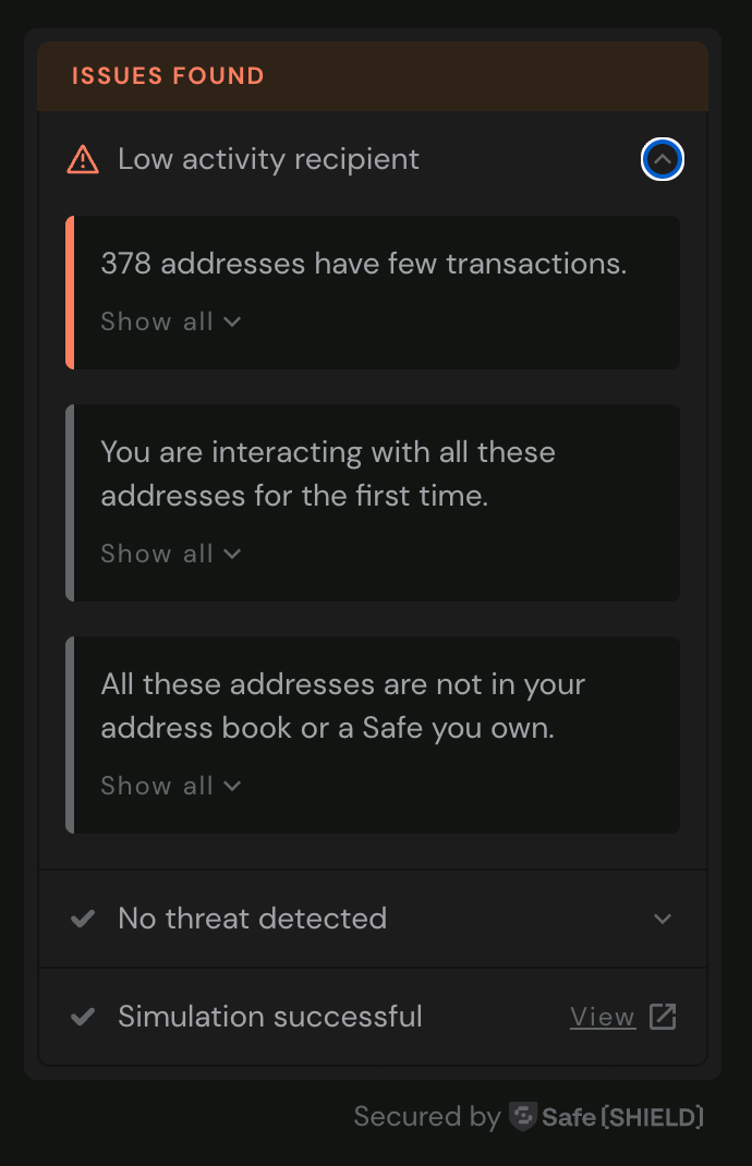 空投的過程中,Safe Wallet 作出以下提醒,叫我警惕 400 位接收者當中,全數為首次跟我交易的錢包,九成以上只做過很少交易。